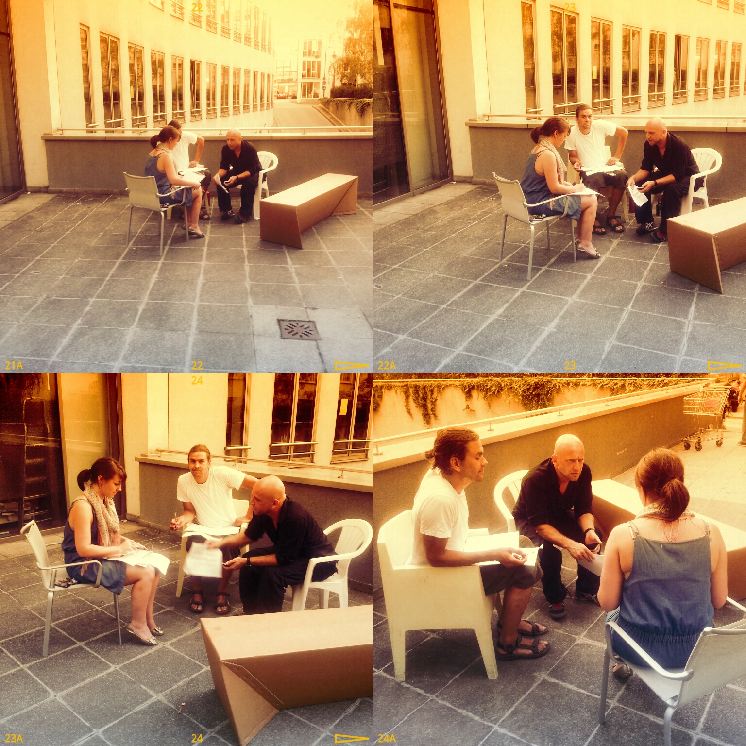 Maff Honzik, der Mann in Schwarz bespricht mit Martina Huber und Christian Korherr Marketing- und Temperaturbewältigungsmaßnahmen.