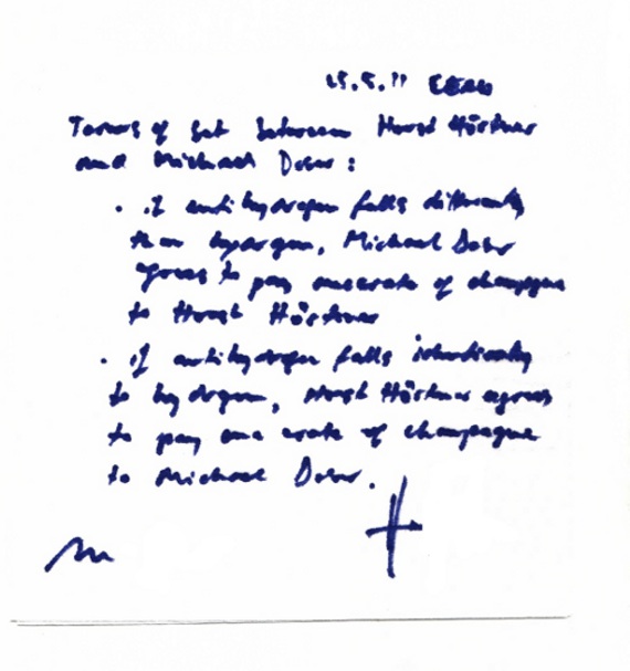 One of the unsung connections between Ars Electronica and CERN is this document, written on a napkin, in which Michael Doser and Horst Hörtner arrange a bet wheter or not anti-matter-particles behave the some way towards gravity as their matter-brothers or not. The winner gets champagne, but of course, if Horst Hörtner wins, he’ll get his champagne from the winner of a nobel prize.