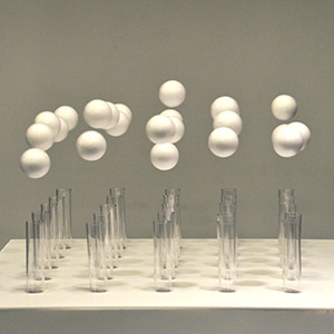 Tanz mit der Luft: atOms und MoLECULE sind zwei eigentlich unsichtbare kinetische Installationen. Dass sie im Wesentlichen aus instabilen Luftschichten in Bewegung bestehen, ist durch kleine weiße Bälle zu erkennen, die von einer Anordnung mehrerer Ventilatoren in Schwebe gehalten werden.