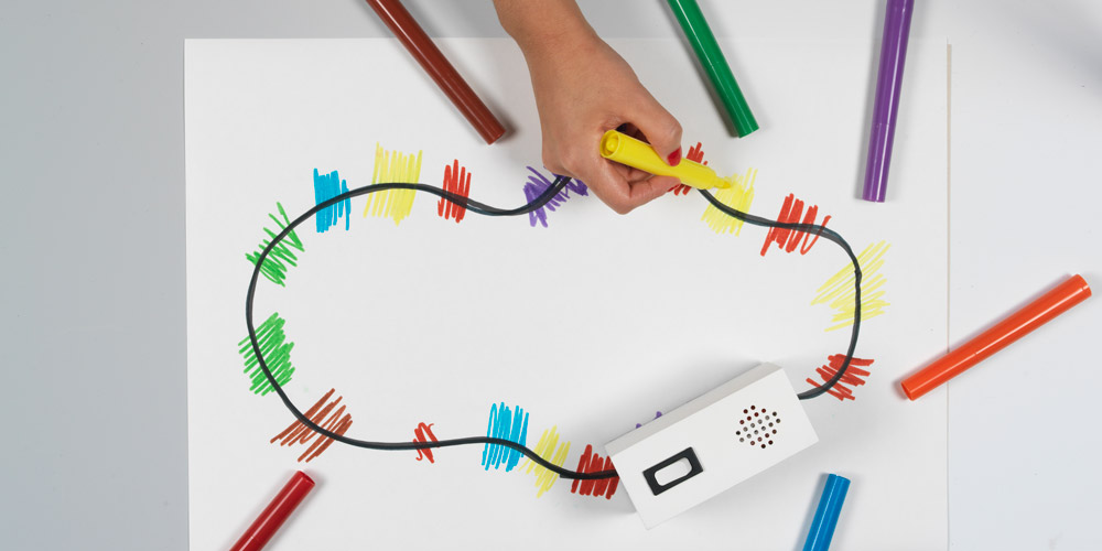 Looks Like Music is an installation centered around Yuri Suzuki’s sound piece Colour Chaser, in which a miniature robot detects and follows a black line. When it crosses colored lines it translates this data into sound. Visitors can draw on paper and simultaneously compose music, thus helping to create a large-scale picture and a sound piece at the same time.