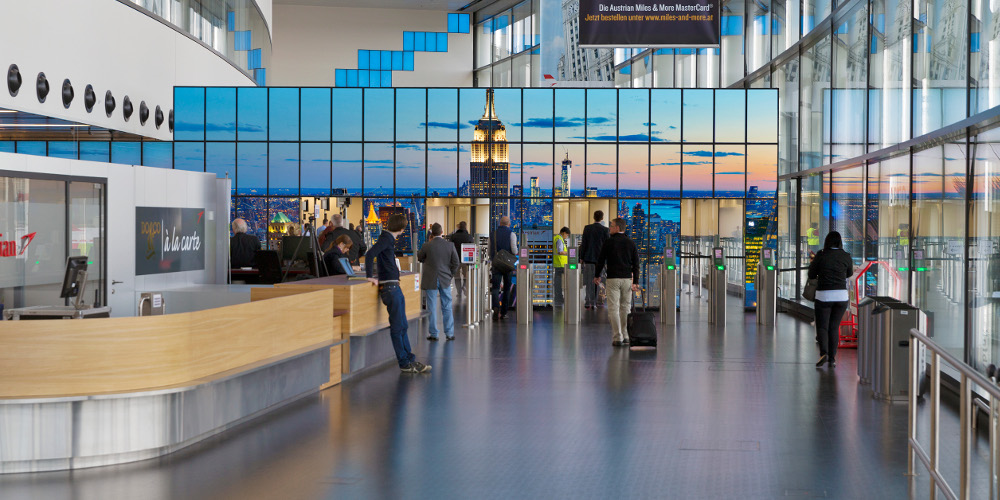 ZeitRaum [TimeSpace] is an interactive art installation Ars Electronica Futurelab developed for Vienna International Airport’s new Skylink terminal. It interprets arriving and departing flights in real time. ZeitRaum consists of several individual stations that accompany passengers on the way to their gate. Ars Electronica Solutions recently added From Austria to the World and Drei – Es geht auch anders—gigapixel images of New York alternating with textscapes and visuals that react to passengers’ presence. The Airport Wall on display in Future Playground not only links the respective presentation spaces of the Futurelab and Solutions; it also symbolizes Ars Electronica’s successful competence network.